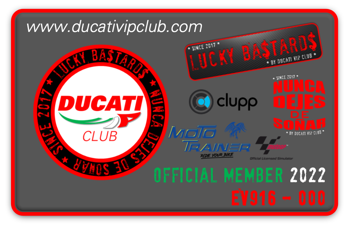 Por último te invitamos a formar parte de nuestra familia Lucky Ba$tard$ adquiriendo tu membresía DUCATI VIP CLUB 2022 con la que tendrás importantes beneficios con nuestros Aliados Desmodrómicos: agencias oficiales, talleres especializados, Moto Trainer LATAM y seguros clupp.